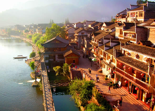 湖南鳳凰古城始建于清康熙四十三年〔1704年〕,歷經(jīng)300多年的風(fēng)雨滄桑,古貌猶存,F(xiàn)東門和北門古城樓尚在。城內(nèi)青石板街道,江邊木結(jié)構(gòu)吊腳樓,以及朝陽(yáng)宮、古城博物館、楊家祠堂、沈從文故居、熊希齡故居、天王廟、大成殿、萬(wàn)壽宮等建筑,無不具古城特色。古城以古街為中軸,連接無數(shù)小巷,溝通全城。古街是一條縱向隨勢(shì)成線、橫向交錯(cuò)鋪砌的青石板路,自古以來便是熱鬧的集市,如今更加生機(jī)勃勃。鳳凰古城的標(biāo)志性建筑之一虹橋,原名臥虹橋,歷史悠久。鳳凰古城北門城樓本名“碧輝門”,采用紅砂條石筑砌,既有軍事防御作用,又有城市防洪功能,是古城一道堅(jiān)固的屏障。鳳凰古街兩邊建筑飛檐斗拱,店鋪中陳設(shè)著琳瑯滿目的民族工藝品,濃濃的古意古韻,透出古街深厚的民族文化底蘊(yùn)。